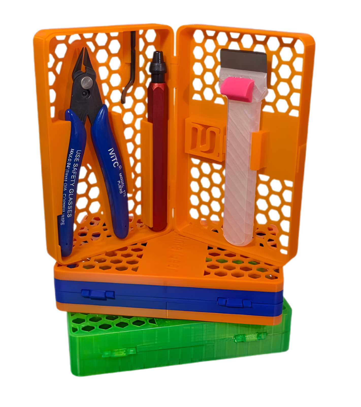 With our entry 3D Printed Tool Kit, you get all the tools you need to get started printing right away. In the box is a spatula for getting prints off the plate, a deburring tool to clean up sharp edges off your prints, and a pair of flush cutters for cutting filament or supports.
