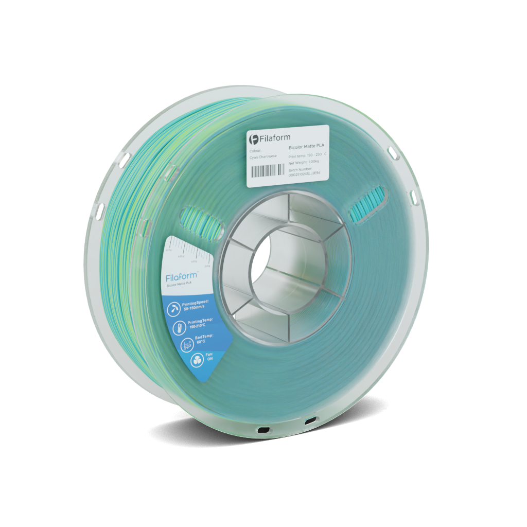 Filaform Dual Matte PLA filament features two complementary colours in a smooth, low-gloss finish, producing striking dual-tone prints straight off the nozzle with no filament swapping required.