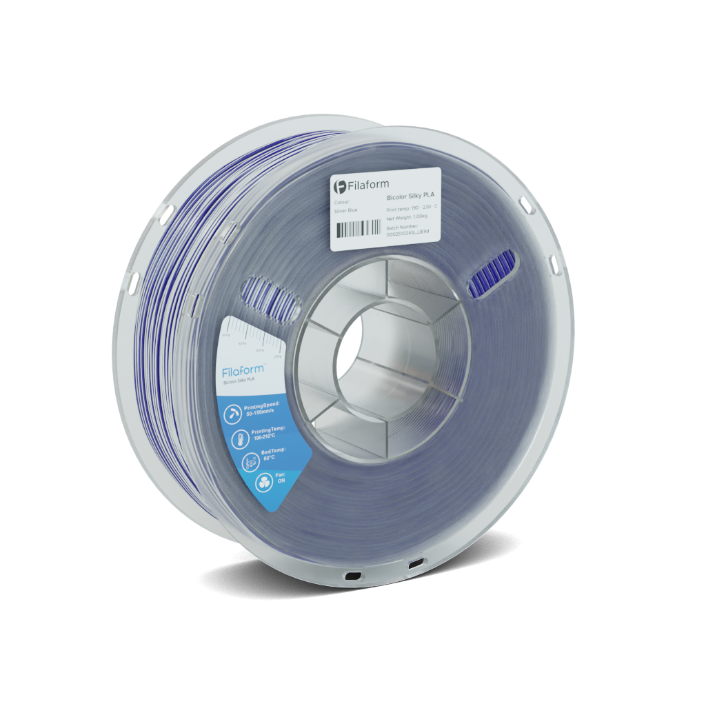 Filaform Dual Bicolour Silk PLA filament combines two contrasting colours with a high-gloss silk finish, producing striking prints with vibrant colour shifts and a smooth, reflective surface straight off the printer.