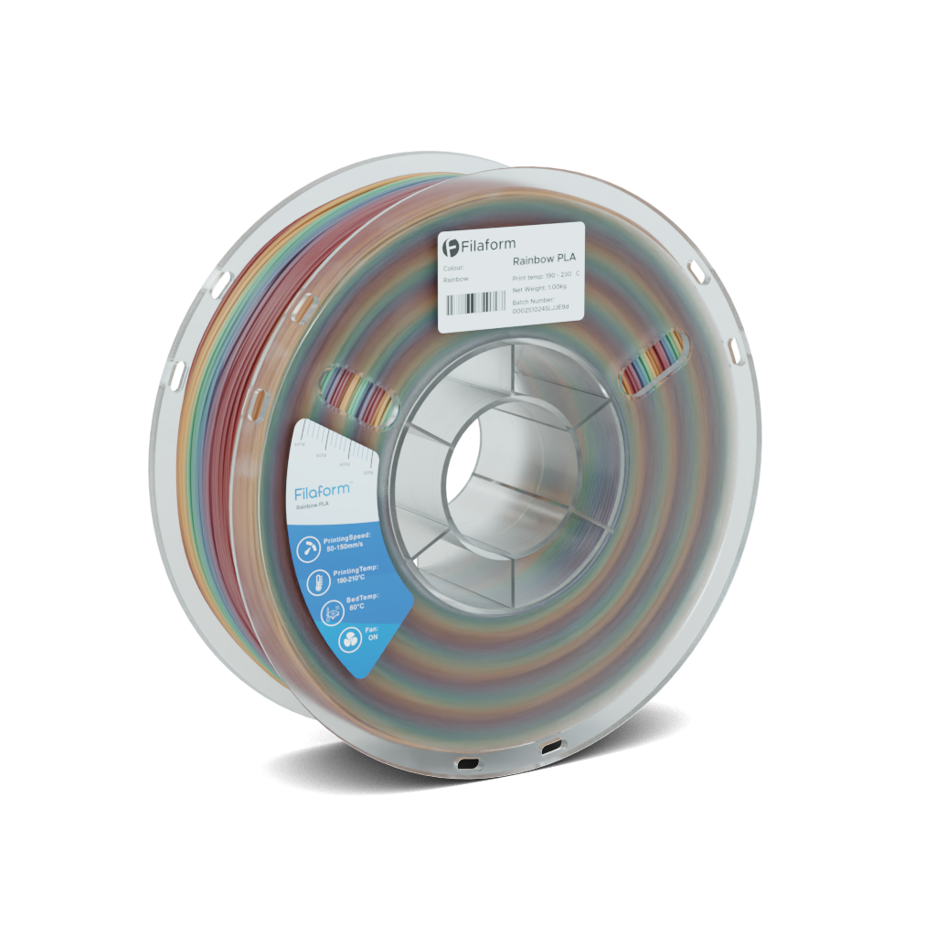 Filaform Rainbow PLA filament features smooth colour transitions along the length of the filament, producing vibrant multi-colour prints with classic PLA surface finish and reliable everyday performance.