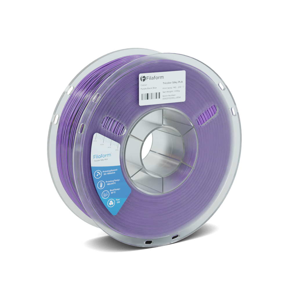 Filaform Tricolour Silk PLA filament combines three contrasting colours in a high-gloss silk finish, producing dramatic colour shifts, metallic highlights, and vibrant, eye-catching prints with minimal warping and excellent layer adhesion.