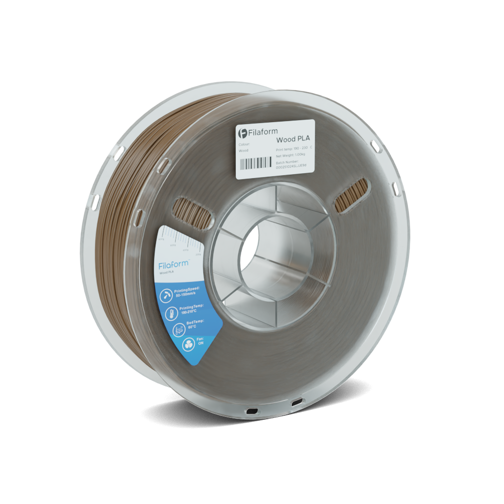 Filaform Wood PLA combines premium PLA with fine wood fibres to create prints with natural wood-like textures and finishes. Each spool produces unique grain patterns, delivering authentic wooden aesthetics straight from your 3D printer.